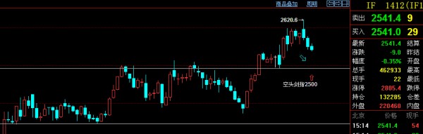 今天股指下跌并没有前两天顺畅,但是终于还是跌了,尽管盘中有多头自救,到下午一点半都翻红了,但是我们昨天从成交量上分析是多头并不能有效反击。原文是这样会说的“从成交量看,今天明显缩量,显示多头接盘无意又无力。第二步再看持仓量,持仓量并无明显变化,维持在20万手,新空头也没有罢手离场”(链接:11月19日股指期货预测与对策),所以,今天1点半后,股指直线下落,再创日内新低,跌至2531点空头才有所减仓。最后收于2532点附近。