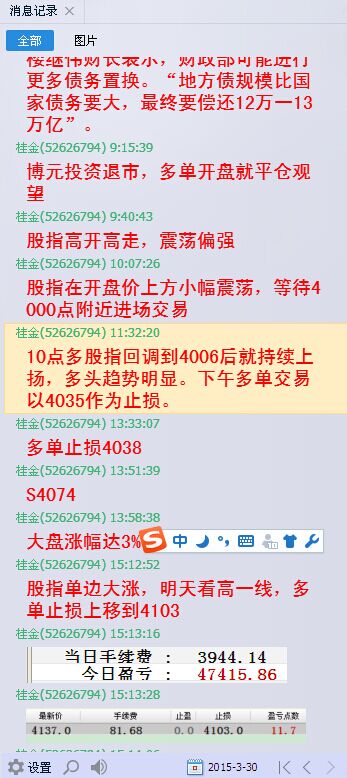 股指期货IF1504合约,正如我上篇博客提到的一样,到了月末大发神威,出现了150点的大行情。股指周一比上周五上涨154点,多头得意地用乐谱唱就是”多!我发!“周末有两则消息引人注目,一则是博元投资退市,一则是楼继伟说财政部要通过置换”偿还地方债务12-13万亿“,第一则消息略偏空,而第二则消息则刺激市场的想象空间,各路多头主力疯狂拉升。我开始还有点担心空头借第一则消息打压一下,但是25分钟后,就只见多头勇猛,不见空头发威,才持续转而做多。实战获利不少,单手盈利却仅仅80来点不算理想。盈利多主要还是认定月末行情大,加大仓位操作造成的。