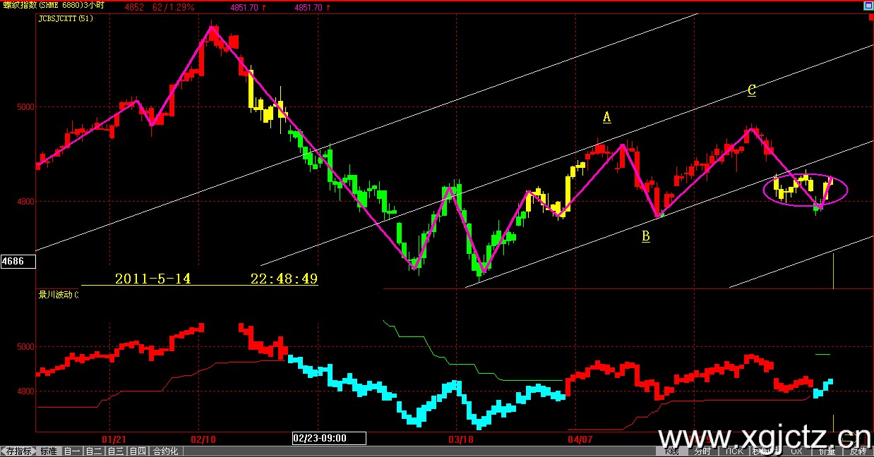 周边市场和相关品种看,欧美股市整体处于2009年以来的牛市当中,虽然近期出现了一些调整,但其牛市根基没有发生改变,表明目前全球经济的主题仍然是健康的,对商品的支持也没有消失。波罗的海航运指数运行在调整通道内,表明经济活跃程度偏低,短期内商品价格的动力不足。在经历了1月份以来的持续下跌之后,近期美元指数步入反弹行情当中,从运行上看,其突破了2008年3月以来的上升趋势线之后,此次反弹带有一定的回抽性质,短期内将受制于77的反压线,一旦该位成功阻止其进一步动作,则商品市场的压力将随之解除。全球商品综合指数近期快速从其调整区间顶部滑落到区间底部,目前在其实现了一个C浪性质的推动结构后有所反弹,其区间底部能否成功坚守是市场近期运行的关键,一旦回升失败,则其下方空间将被打开。