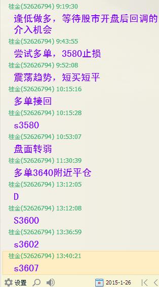 If1502股指期货今日跳空高开后反复震荡回落,至11点一刻回落到3570附近,之后震荡上扬,最高摸至3635点,收盘于3625点,比上一个交易日收盘上涨29点。涨幅有所扩大。我们开盘建议逢低做多,一单盈利,一单止损,总体盈利14点。很显然盘中没有完全坚持逢低做多,导致有一单亏损。好在消息面的利多得到市场的呼应,尾盘持续做多获得盈利。