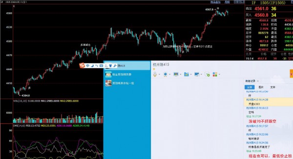 股指期货IF1504合约临近交割,波动会加大昨天也提示了。今天比昨日收盘大涨173点。昨天我的文章提到如果IF1505合约跌破4370才会做空,但是今天的股指低开高走,根本没有做空的迹象。半小时后强势尽显,我们提示多单进场。之后股指持续走强,考虑到临近交割日的波动会比较大,所以激励群内朋友积极做多,最低目标锁定在4480点。不到一小时,股指第一目标即实现,减仓锁定利润后,余部跟随市场自由发展,获利超过100点,占到波动的70%。