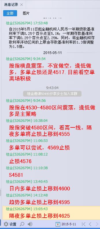 IF1505今日在降息利好刺激下高开高走,收盘比上周五上涨117点。我们上周四预测周五完成调整的最后一跌,周五下午多单进场抄底成功,4480、4510多单持续进场,然后以4517为止损隔夜持有。详文请点击5月11日股指期货操作策略隔夜单止损今日三次上移,目前以4625作为止损确保120点的盈利。日内单子也有不低于30点的获利。