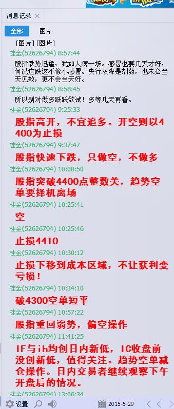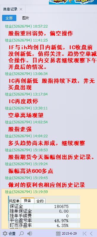 股指期货IF1507合约在央行降息降准的利多刺激下高开123点,开盘于4335,稍稍冲高即告下滑,我们群内也是发出提示只做空不做多。9点40分左右就跌破昨天收盘价4212,之后股指再度爬升,上午10点08分摸高至4408.8点就无力拉升,10点25分,我群内再度发布明确做空指令,股指逐波下滑,这次竟一发不可收,到下午13点20分左右触及跌停。10分钟后反弹出现,群内按提示空单离场。下午14点04分股指反弹至4280一线失去动力,我们判断多头趋势未成,可再度进空,之后股指下滑到4014收盘。全天股指下跌198点。我们看空做空获利丰厚,最少获利60点,多的则达到获利接近50%,有点利佛摩尔说的做上一日国王的味道。