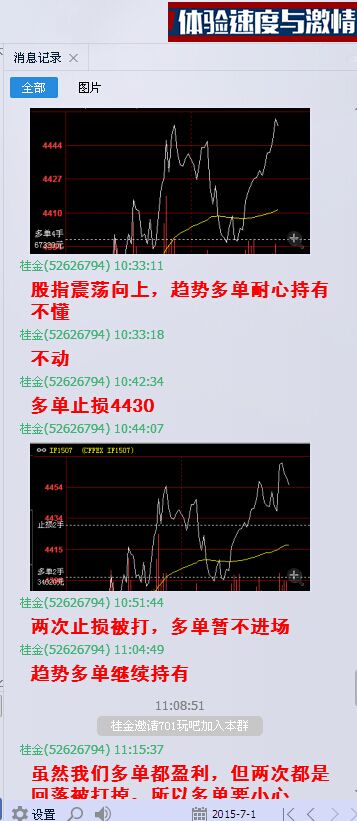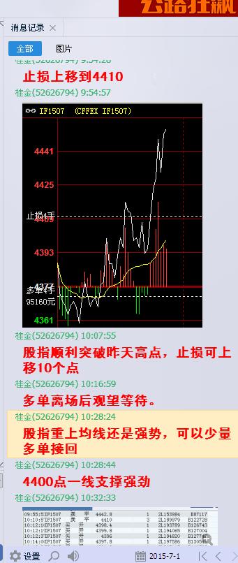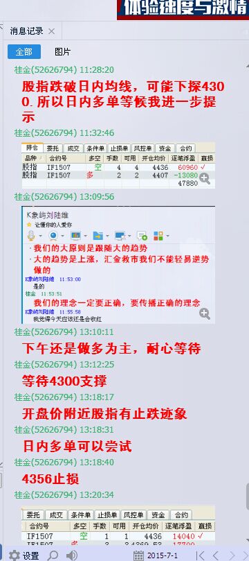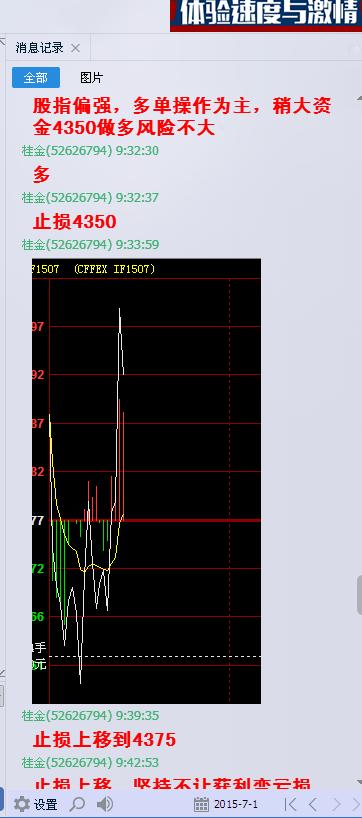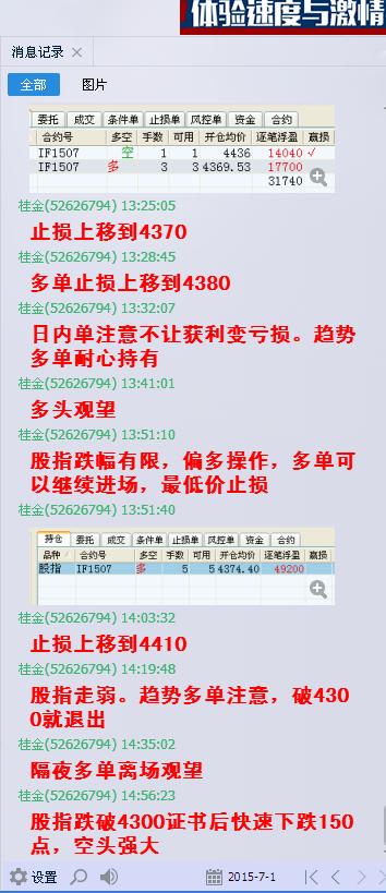 股指期货IF1507合约今天高开低走,下午2点之后跳水400点。终盘比上个交易日下跌328点。我们早盘两次做多均获利。但是都是被动止盈,所以下午尝试多单仓位减少,把握不好的就会无功而返。随着IC走弱,我群指令隔夜多单离场。汇金救市终究成了一日游的行情,随着隔夜多单的离场,股指再现雪崩式下跌。群内没追空的基本微利或者打平。
