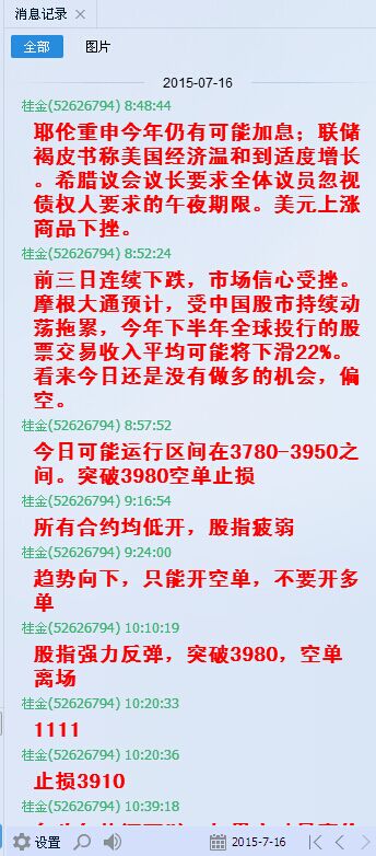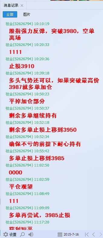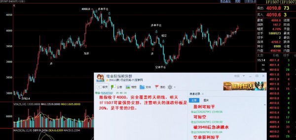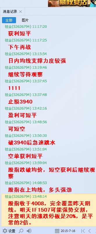 股指期货IF1507合约今日低开,下探昨日低点3780,之后迅速反弹,9点50多分就突破3980,显示趋势已经扭转,我们观察到这之后在10点20分第一次发出做多指令,10点49分多单加仓,11点02分多单平仓,获利135点左右。11点09第二次多单,11点17分平仓;下午13点37第三次进多单,5分钟后平仓。13点48分股指跌破3940下达追空指令,3分钟后13点51分空单平仓。全天四单全部盈利。今天由于加仓操作与空单都使用了,交易获利大于日线150点的涨幅,实际盈利在180-300之间。(以下截图为桂金股指实战群喊单,1代表做多,0代表清仓)
