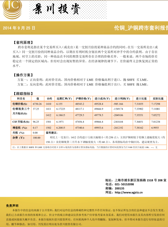 【景川投资】20140925——9月24日伦铜沪铜跨市套利报告