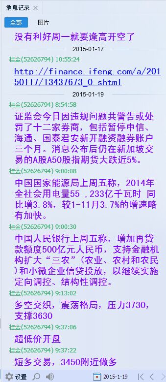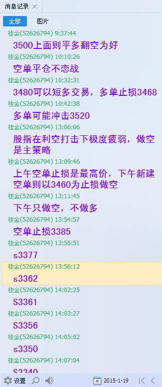股指期货IF1502合约在利空消息的打压之下,跌停收盘。创下新的历史记录。我们上周五趋势多单3573止损离场,当天盘后建议周一只要不出现重大利好就偏空交易。周六发布中信证券套现100亿的消息。今天在技术面与消息面共振之下,大盘大幅低开探至3400点后反弹一小时,第一小时我们顺势做多,3500上方平多翻空。但是第二小时一度逢低做多,可能有的群友造成12点以上的止损。午后继续看空做空。3335平空。全天盈利70点。以下是做单提示截图,s表示保护性止损。