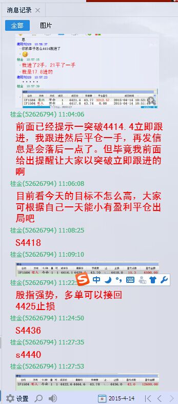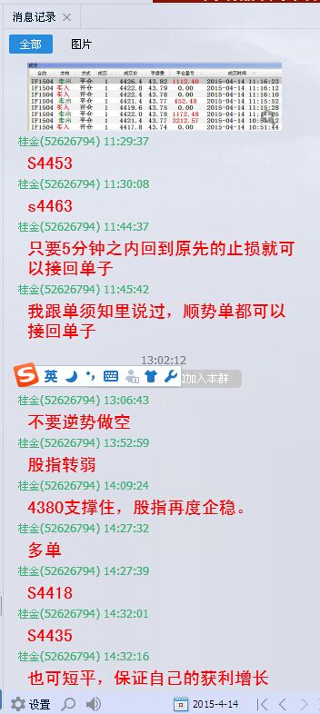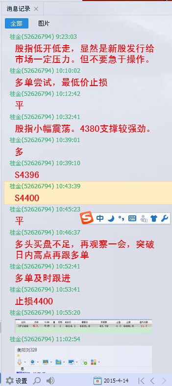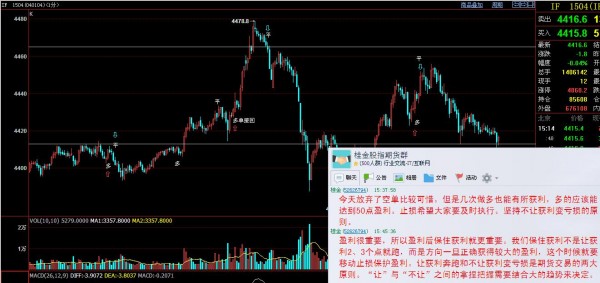 综合起来看,股指接近4500点时多空分歧加大,盘中出现宽幅震荡,持仓也出现较大幅度的减少。3月份全月上涨400点而4月份不到半个月就上涨了400多点,显示市场上涨加速,恐高心理逐渐增加。从明天一天来看应该是还有下探的空间,但是总体来说,多头趋势明显,天天创新高,何苦去做空?长线布局空单也不到时候,不要去猜市场头在哪里顶在何方。一切都该顺势而为。明天下滑可以短空,但是长多短空的主策略不要忘记。也许新的低点又是隔夜多单的进场机会。具体低点再哪里还是看盘中走势。加我QQ进体验组一起实时喊单。只有严格遵守自己的交易系统,认清大势方能分享这牛市盛宴。不要怀疑,不要想还能涨吗。只要做好你的资金管理,遵循交易原则。