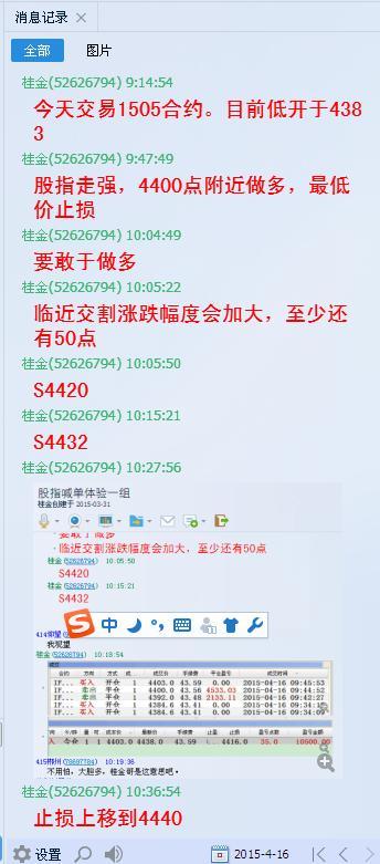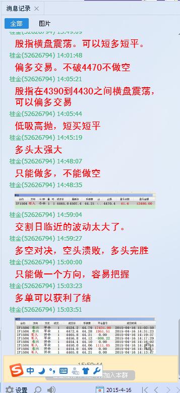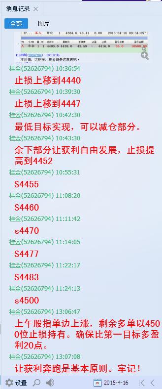 股指期货IF1504合约临近交割,波动会加大昨天也提示了。今天比昨日收盘大涨173点。昨天我的文章提到如果IF1505合约跌破4370才会做空,但是今天的股指低开高走,根本没有做空的迹象。半小时后强势尽显,我们提示多单进场。之后股指持续走强,考虑到临近交割日的波动会比较大,所以激励群内朋友积极做多,最低目标锁定在4480点。不到一小时,股指第一目标即实现,减仓锁定利润后,余部跟随市场自由发展,获利超过100点,占到波动的70%。