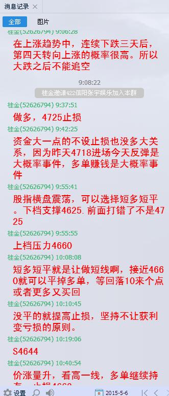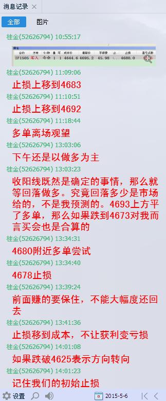 股指IF1505今日先反弹后回落,终盘比周二下跌39点。我们主要是开盘做多做到一波大的反弹,在4630区域买进做多,4690上方区域卖出平仓。下午试探一次多单可能有人止损几个点,跌破上午低点后看空。群内单手盈利不低于60点。
