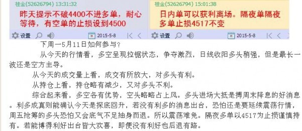 IF1505今日在降息利好刺激下高开高走,收盘比上周五上涨117点。我们上周四预测周五完成调整的最后一跌,周五下午多单进场抄底成功,4480、4510多单持续进场,然后以4517为止损隔夜持有。详文请点击5月11日股指期货操作策略隔夜单止损今日三次上移,目前以4625作为止损确保120点的盈利。日内单子也有不低于30点的获利。