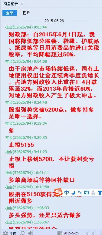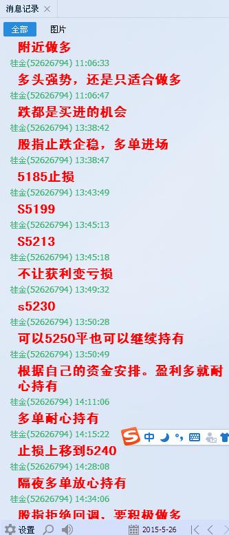 股指期货IF1506合约周二比昨天高开14点,15分钟上冲50点到5220,股市开盘后逐步回补缺口,之后逐步上攻震荡上行,终盘收于5274.8点,比昨天收盘上涨118点。我们日内单没开盘进场,只好等到9点39分回落到5190时进场做多,之后将止损上移到5200确保获利。10点过10分后股指回补缺口回升到昨天收盘价之上我们提示做多。之后股指震荡上行,日内止损有时候被扫,按照我们群内发的跟单提示我们回到止损上方又继续做多。总之全天只做多,不做空。始终坚持牛市只做多的原则。全天获利接近100点。
