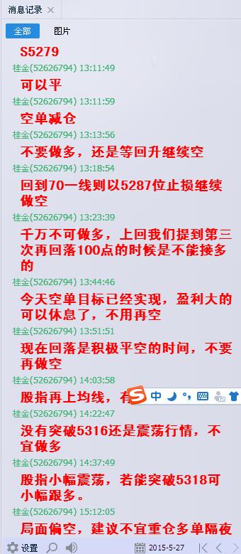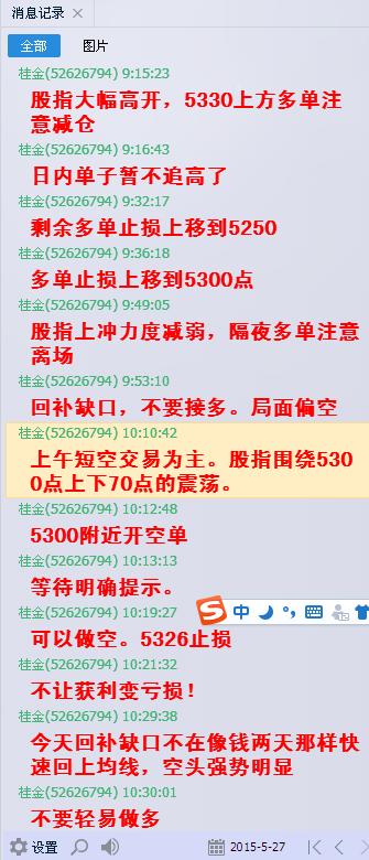 综合起来看,股指7天连续上涨820多点后出现回调,多头进攻欲望下降是在情理之中,总体多头趋势持续创新高。所以今日我们空单得手及时获利了结。随着行情的进展,上攻需要更多的增量资金,追高容易遭到获利盘的打压,选逢低做多做主要策略,则支撑在5220附近。空单低位平掉后也可卷土重来,所以明天还是要谨慎少量操作。不要频繁操作更不能重仓操作。具体走势得市场说了算。预测只是预测,交易者最要紧的是注意对策。具体操作提示可在实战群与体验组看到。加我QQ可进体验组。只有严格遵守自己的交易系统其交易方能把市场给出的一些机会转为财富收入囊中。只要做好你的资金管理,遵循交易原则。盈利就一定会出现!