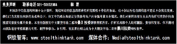 4、钢价小幅回调,库存继续下降 钢价没能持续上升,主要品种价格出现小幅回调。上一周钢材价格并没有出现持续上涨,主要品种出现小幅回调。进入旺季钢材价格没能持续上升,我们认为其主要原因是政府回收流动性以及控制房地产价格导致的下游需求不强劲。经销商库存继续下降,但速度有所减缓。经销商钢材库存连续3周下降,上一周环比减少1.1%,但下降速度有所减弱。由于经销商方面钢材交易在逐渐转好,因此我们预计后期钢材库存将继续下降。产量方面,进入3月以现货成本计算钢厂已出现小幅亏损,因此我们预计3月粗钢日均产量将环比持平或小幅下降。原材料价格止跌回升,预计后期将温和上涨。由于钢材价格已经筑底,上周主要原材料价格继续小幅回升。唐山地区铁矿石价格周环比上升1.5%,价格为1360元/吨,焦炭价格7周维持不变,价格为2120元/吨。预计后期随着钢材价格的温和上涨,主要原材料价格也将小幅上涨。