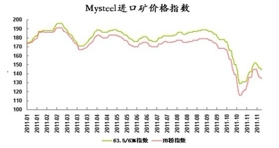11、2012年 3月 2日Mysteel 进口矿价格指数 2日Mysteel进口矿价格指数不变,63.5/63%印粉指数为147,53/52%印粉指数为98,61.5%澳粉指数为142。我的钢铁网铁矿石综合指数报收155.7,较昨日涨0.06%,周同期环比涨0.97%,进口矿指数143.5,与昨日比持平,国产矿指数报收161.3,较昨日涨0.06%。