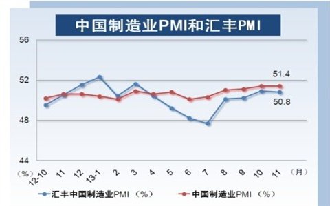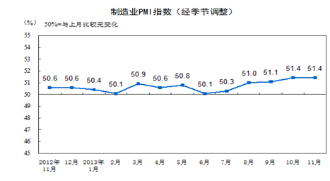 2、国家统计局和物流与采购联合会(CFLP)周日联合公布,中国11月官方制造业采购经理人指数(PMI)为51.4。较上月持平并高于市场预期,该指数自7月以来连续四个月小幅上升后转为平连续14个月位于临界点以上。